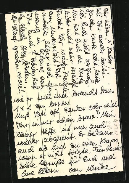 Personenbezogene Daten auf der Rückseite der Karte wurden durch blauen Textmarker unkenntlich gemacht. Die blauen Stellen sind auf die Vorderseite durchgeweicht und wirken sich negativ auf das Postkartenfoto aus