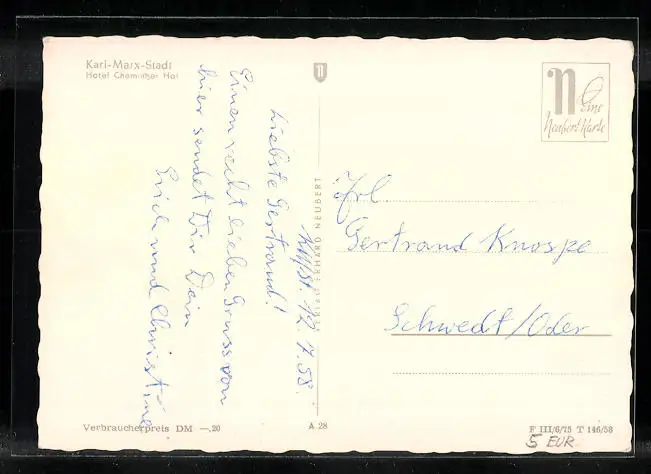 Personenbezogene Daten auf der Rückseite der Karte wurden durch blauen Textmarker unkenntlich gemacht. Die blauen Stellen sind auf die Vorderseite durchgeweicht und wirken sich negativ auf das Postkartenfoto aus