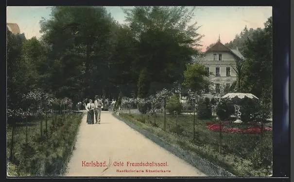 AK Karlsbad, Cafe Freundschaftssaal, Flaneure im Park
