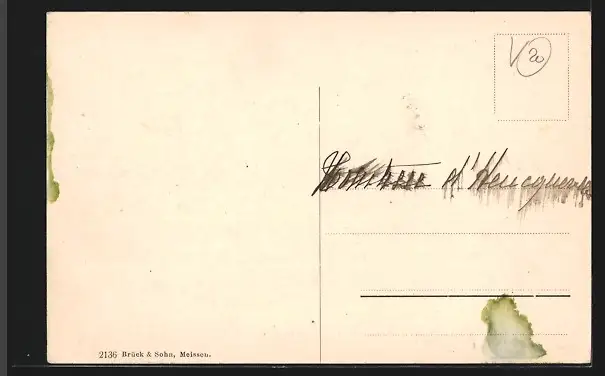 Personenbezogene Daten auf der Rückseite der Karte wurden durch blauen Textmarker unkenntlich gemacht. Die blauen Stellen sind auf die Vorderseite durchgeweicht und wirken sich negativ auf das Postkartenfoto aus