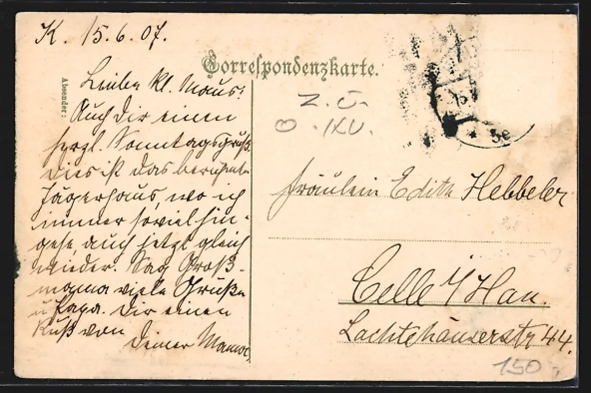 alte Ansichtskarte, gelaufen 1907, Briefmarke entfernt, Stempelspur, rückseitig Oberflächenschaden, guter Zustand