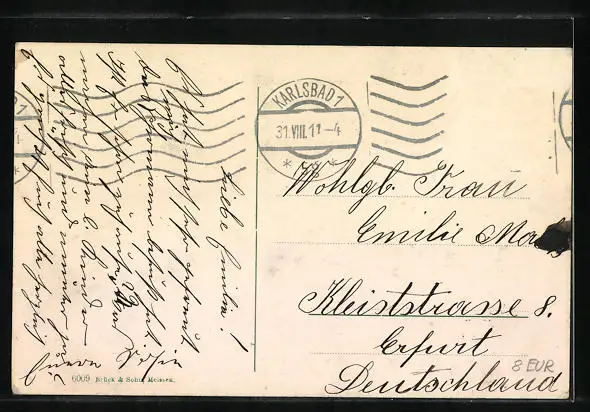 gelaufen 1911, Briefmarke entfernt, rückseitig Oberflächenschaden, Stempelspur, guter Zustand