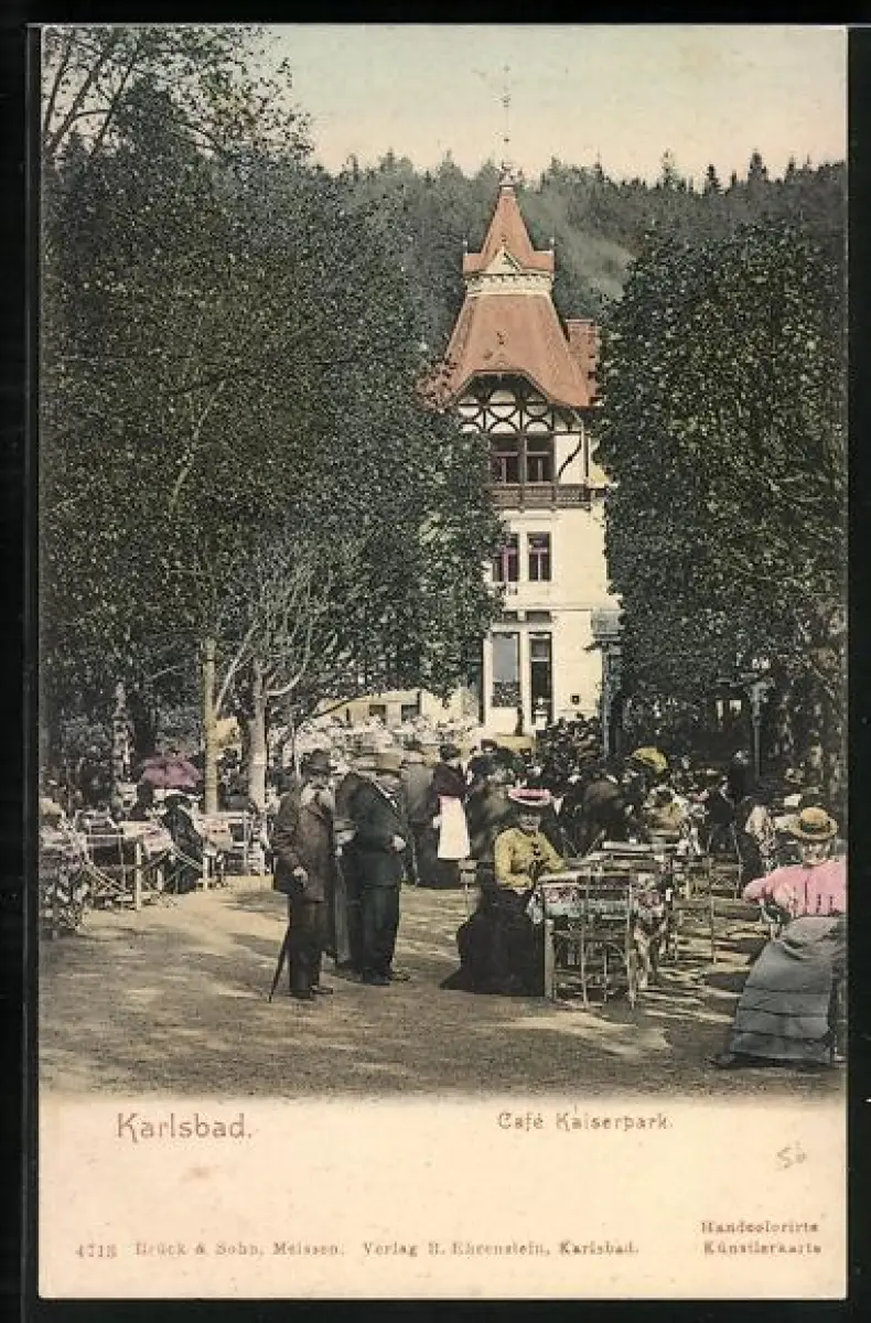 AK Karlsbad, Cafe Kaiserpark mit Garten
