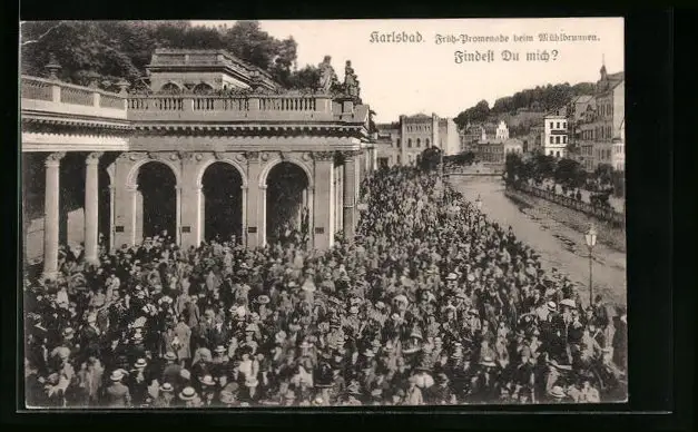 AK Karlsbad, Früh-Promenade beim Mühlbrunnen
