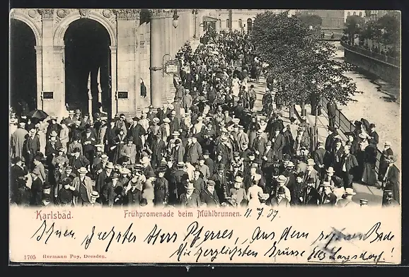 AK Karlsbad, Frühpromenade beim Mühlbrunnen