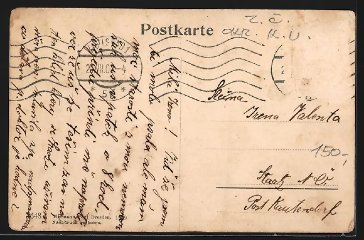 alte Ansichtskarte, gelaufen 1909, Briefmarke entfernt, rückseitig Oberflächenschaden, Eckknick li. oben, guter Zustand