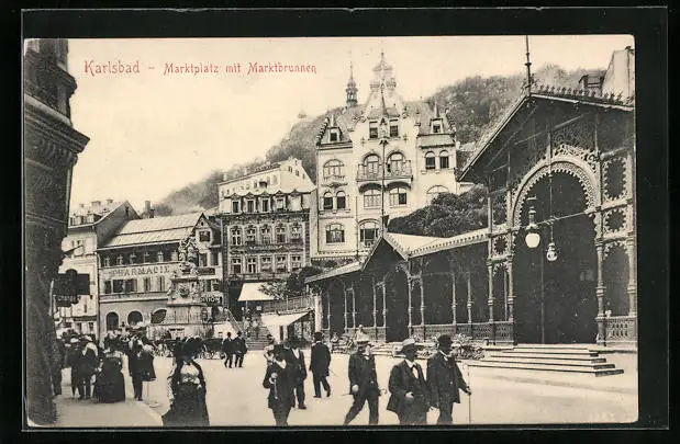 AK Karlsbad, Marktplatz mit Marktbrunnen