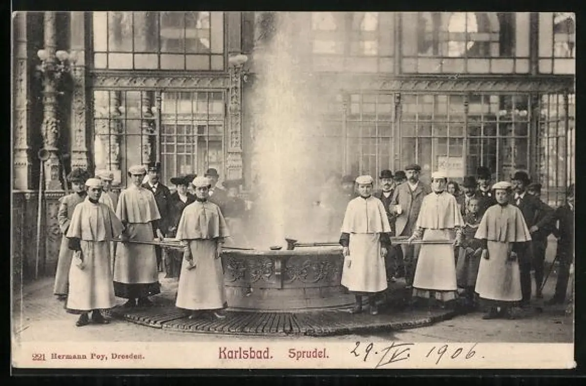 AK Karlsbad, Sprudel mit Personal und Kurgästen