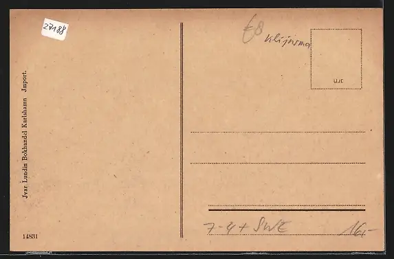 Personenbezogene Daten auf der Rückseite der Karte wurden durch blauen Textmarker unkenntlich gemacht. Die blauen Stellen sind auf die Vorderseite durchgeweicht und wirken sich negativ auf das Postkartenfoto aus