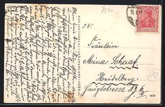 Personenbezogene Daten auf der Rückseite der Karte wurden durch blauen Textmarker unkenntlich gemacht. Die blauen Stellen sind auf die Vorderseite durchgeweicht und wirken sich negativ auf das Postkartenfoto aus