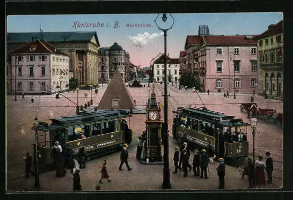 AK Karlsruhe /B., Blick auf den Marktpkatz mit Strassenbahnen