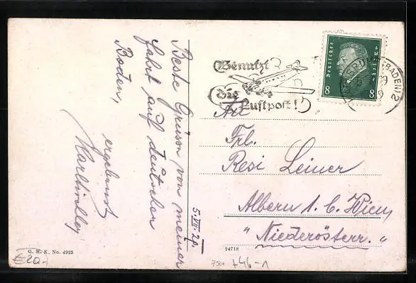 Personenbezogene Daten auf der Rückseite der Karte wurden durch blauen Textmarker unkenntlich gemacht. Die blauen Stellen sind auf die Vorderseite durchgeweicht und wirken sich negativ auf das Postkartenfoto aus