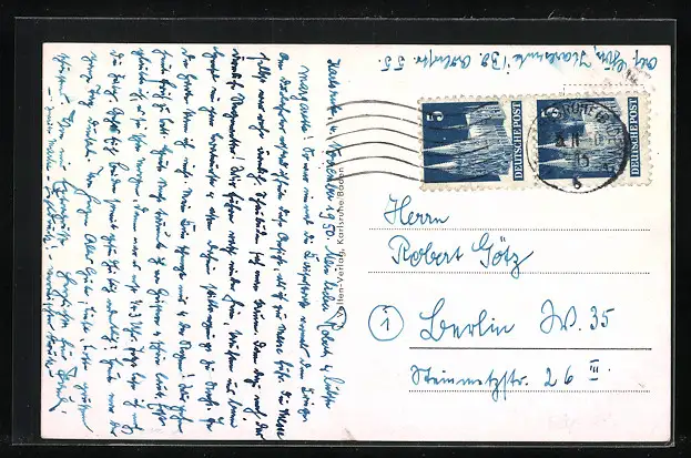 Personenbezogene Daten auf der Rückseite der Karte wurden durch blauen Textmarker unkenntlich gemacht. Die blauen Stellen sind auf die Vorderseite durchgeweicht und wirken sich negativ auf das Postkartenfoto aus