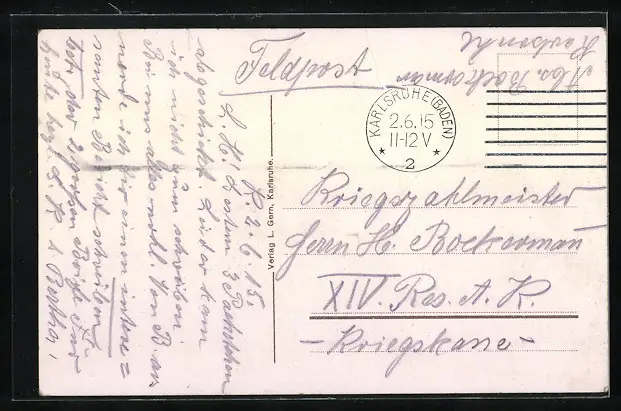 gelaufen 1915, kleiner Einriss oben re, Eckknick oben li., guter Zustand