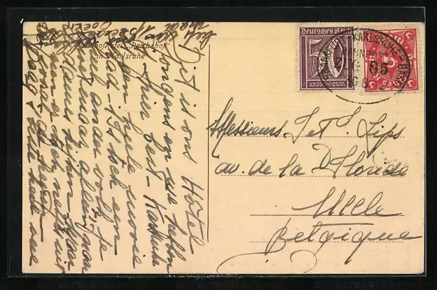 Personenbezogene Daten auf der Rückseite der Karte wurden durch blauen Textmarker unkenntlich gemacht. Die blauen Stellen sind auf die Vorderseite durchgeweicht und wirken sich negativ auf das Postkartenfoto aus