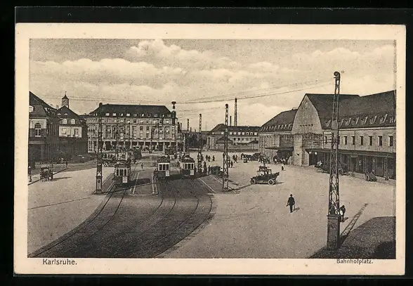 AK Karlsruhe, Bahnhofplatz mit Strassenbahnen, Bahnhof