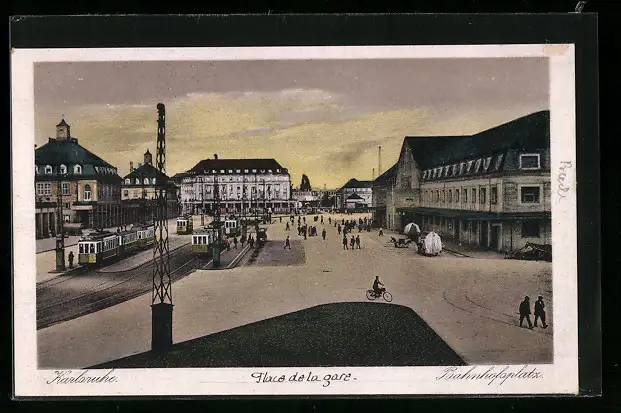 AK Karlsruhe, Bahnhofsplatz mit Strassenbahnen