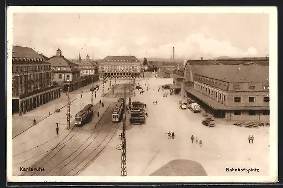 AK Karlsruhe, Bahnhofsplatz mit Strassenbahnen