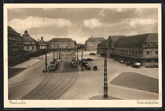 AK Karlsruhe, Bahnhofsplatz mit Strassenbahnen und Automobilen