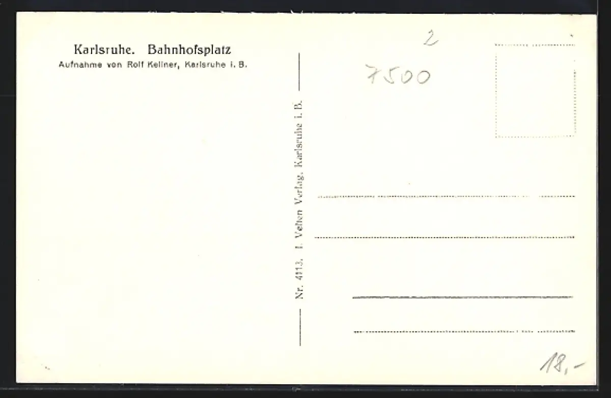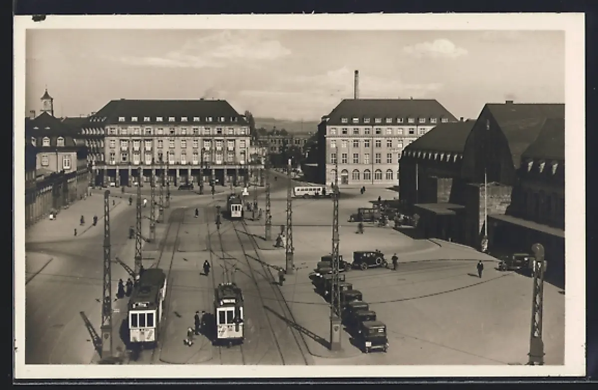 AK Karlsruhe, Bahnhofsplatz mit Strassenbahnen und Hotels