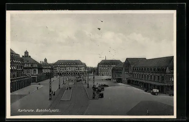 AK Karlsruhe, Bahnhofsplatz vor dem Bahnhof