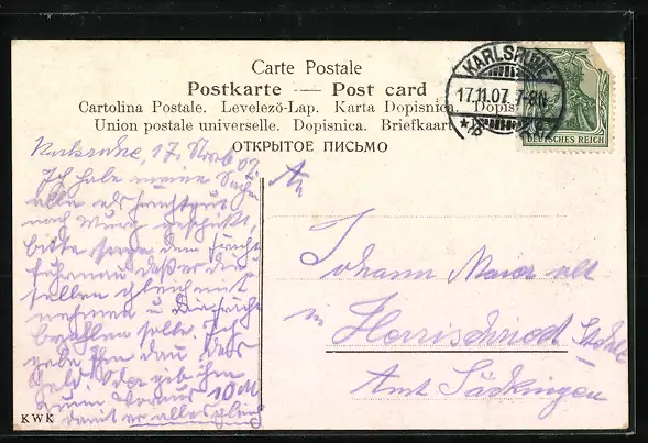gelaufen 1907, Briefmarke entfernt, Eckknick li. oben, guter Zustand