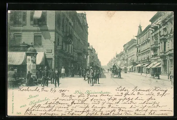 AK Karlsruhe, Blick in die Kaiserstrasse mit Spaziergängern und Kutsche