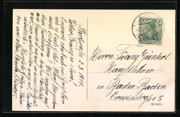 Personenbezogene Daten auf der Rückseite der Karte wurden durch blauen Textmarker unkenntlich gemacht. Die blauen Stellen sind auf die Vorderseite durchgeweicht und wirken sich negativ auf das Postkartenfoto aus
