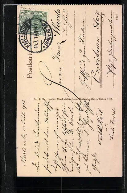 Personenbezogene Daten auf der Rückseite der Karte wurden durch blauen Textmarker unkenntlich gemacht. Die blauen Stellen sind auf die Vorderseite durchgeweicht und wirken sich negativ auf das Postkartenfoto aus