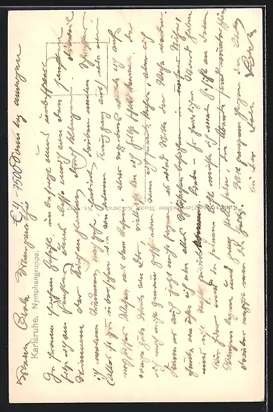 Personenbezogene Daten auf der Rückseite der Karte wurden durch blauen Textmarker unkenntlich gemacht. Die blauen Stellen sind auf die Vorderseite durchgeweicht und wirken sich negativ auf das Postkartenfoto aus