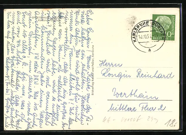 Personenbezogene Daten auf der Rückseite der Karte wurden durch blauen Textmarker unkenntlich gemacht. Die blauen Stellen sind auf die Vorderseite durchgeweicht und wirken sich negativ auf das Postkartenfoto aus