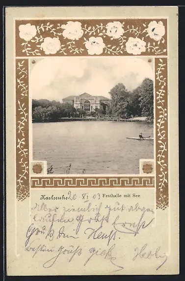 AK Karlsruhe, Festhalle mit See und Kanu