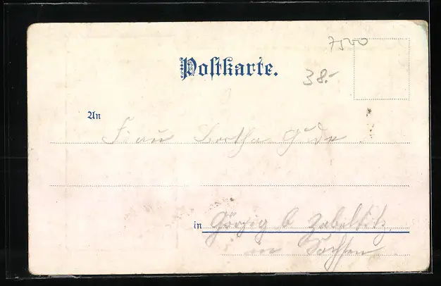 Personenbezogene Daten auf der Rückseite der Karte wurden durch blauen Textmarker unkenntlich gemacht. Die blauen Stellen sind auf die Vorderseite durchgeweicht und wirken sich negativ auf das Postkartenfoto aus