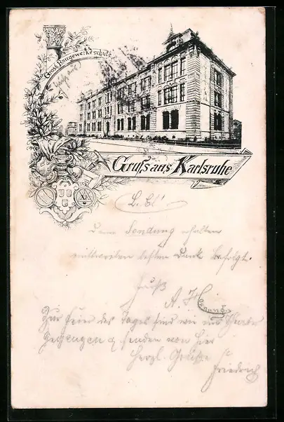 AK Karlsruhe, Grossh. Baugewerkschule mit Strasse, Wappen