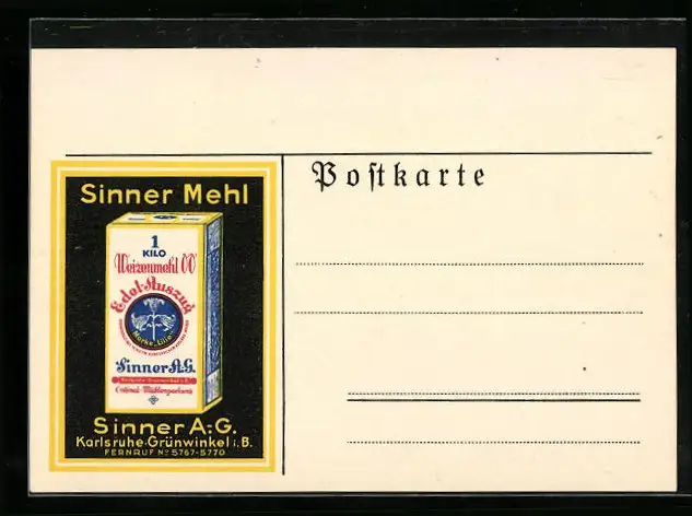 AK Karlsruhe-Grünwinkel, Reklame für Weizenmehl der Sinner AG