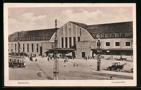 AK Karlsruhe, Hauptbahnhof mit Strassenbahn