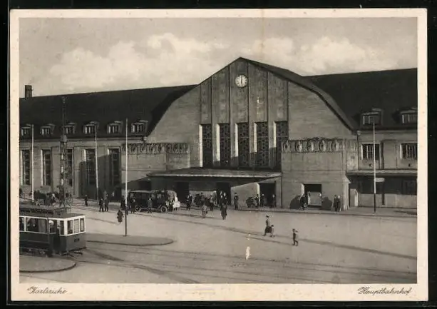 AK Karlsruhe, Hauptbahnhof mit Strassenbahn