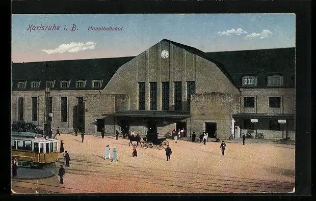 AK Karlsruhe, Hauptbahnhof mit Strassenbahn