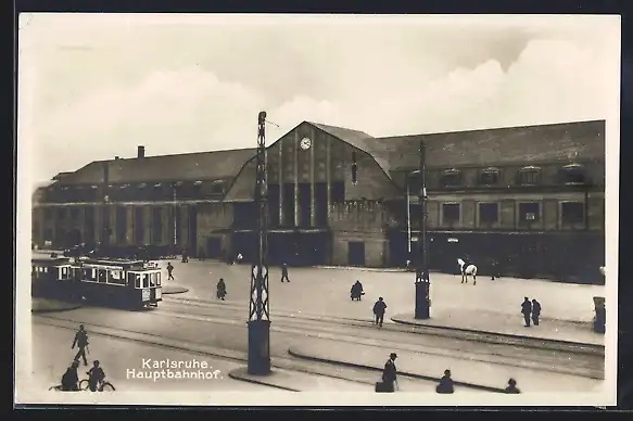 AK Karlsruhe, Hauptbahnhof mit Strassenbahn