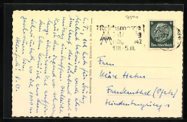 Personenbezogene Daten auf der Rückseite der Karte wurden durch blauen Textmarker unkenntlich gemacht. Die blauen Stellen sind auf die Vorderseite durchgeweicht und wirken sich negativ auf das Postkartenfoto aus