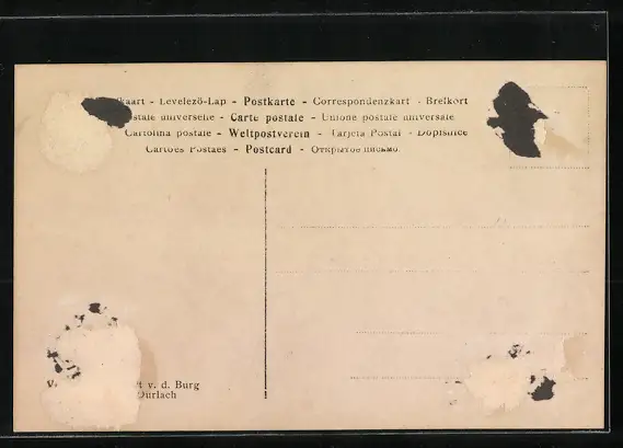 Personenbezogene Daten auf der Rückseite der Karte wurden durch blauen Textmarker unkenntlich gemacht. Die blauen Stellen sind auf die Vorderseite durchgeweicht und wirken sich negativ auf das Postkartenfoto aus
