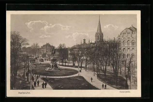 AK Karlsruhe, Kaiserplatz mit Anlagen und Strassenbahn