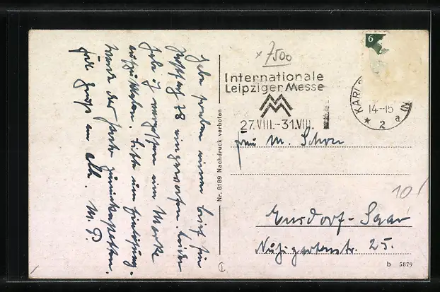 Personenbezogene Daten auf der Rückseite der Karte wurden durch blauen Textmarker unkenntlich gemacht. Die blauen Stellen sind auf die Vorderseite durchgeweicht und wirken sich negativ auf das Postkartenfoto aus