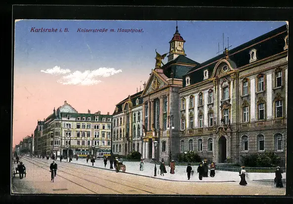 AK Karlsruhe, Kaiserstrasse mit Hauptpost