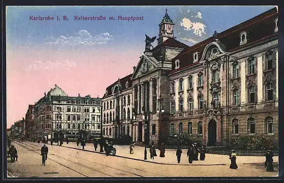 AK Karlsruhe, Kaiserstrasse mit Hauptpost, Strassenbahn