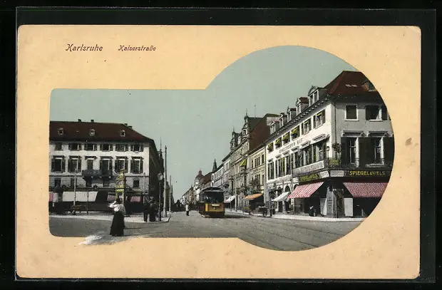AK Karlsruhe, Kaiserstrasse mit Hotel Englischer Hof und Strassenbahn, Passepartout