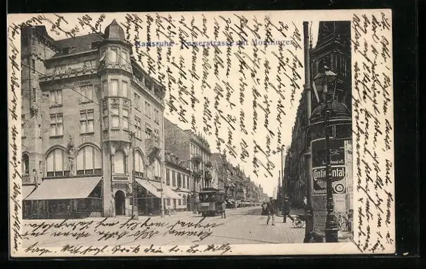 AK Karlsruhe, Kaiserstrasse mit Monninger, Strassenbahn