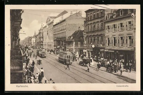 AK Karlsruhe, Kaiserstrasse mit Passanten und Strassenbahnen