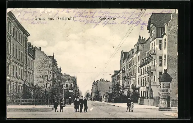 AK Karlsruhe, Karlstrasse mit Litfasssäule