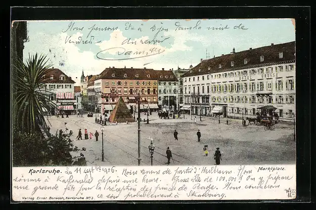 AK Karlsruhe, Kleine Pyramide auf dem Marktplatz